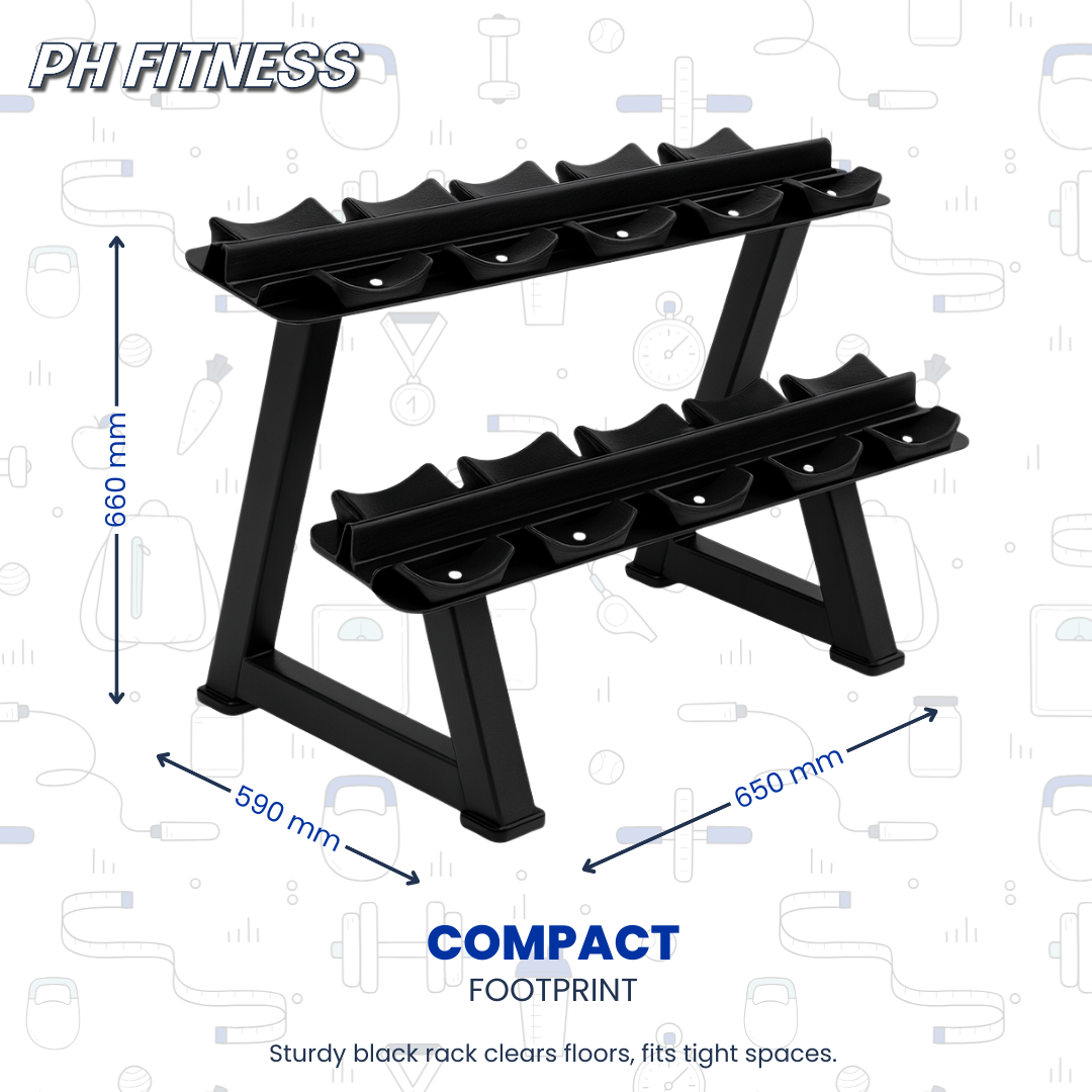 Halten Sie Ihren Trainingsraum mit dem PH Fitness 2-stöckigen Hantelständer organisiert und professionell.